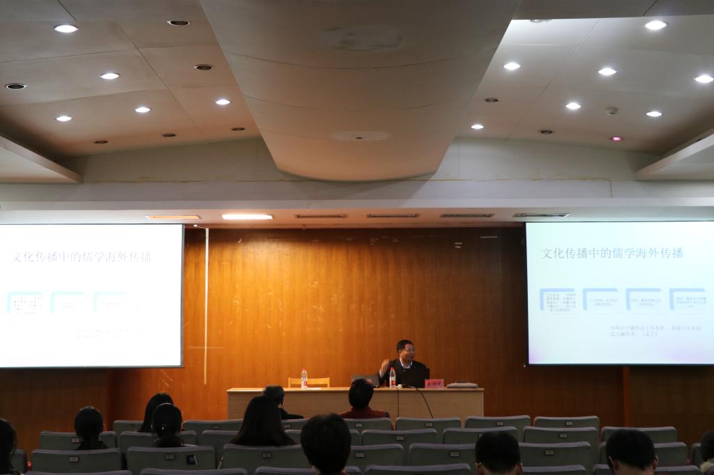 回顾过去,立足将来。秦洪武教授从以往的研究经验谈起,同时结合了浙江传媒学院的传播特色,表达了对中华文化走出去的自信、对儒家文化的认可。随后,他提出了本次讲座的核心论点:“网络社交媒体是儒学海外传播的主要渠道”。秦教授通过数据分析、思维详解等一系列调查方法,向在座听众娓娓道来。同时,他还展示了传统儒家中的“忠”“信”等精神在海外流传数据图,分析孔子学院在世界范围内的分布数据等资料。秦洪武教授认为,这些资料表明了西方国家在对传统儒学的吸收上有更明确的目的和方向,他们将舶来的儒学西化以适应西方社会的需要。秦教授进一步表示:“中国文化在吸取外来文化时,也要坚持文化自信,讲好自己的文化故事。”