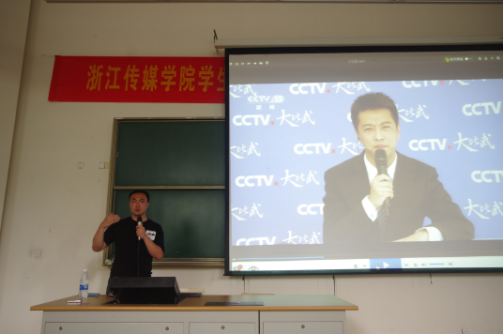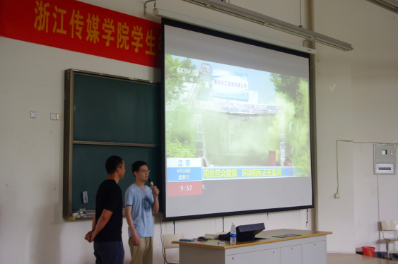 随后,贾林播放了前段时间自己在央视新闻频道报道“长兴水灾”的片段。同学们认真观看,都纷纷举起了手机进行录像。