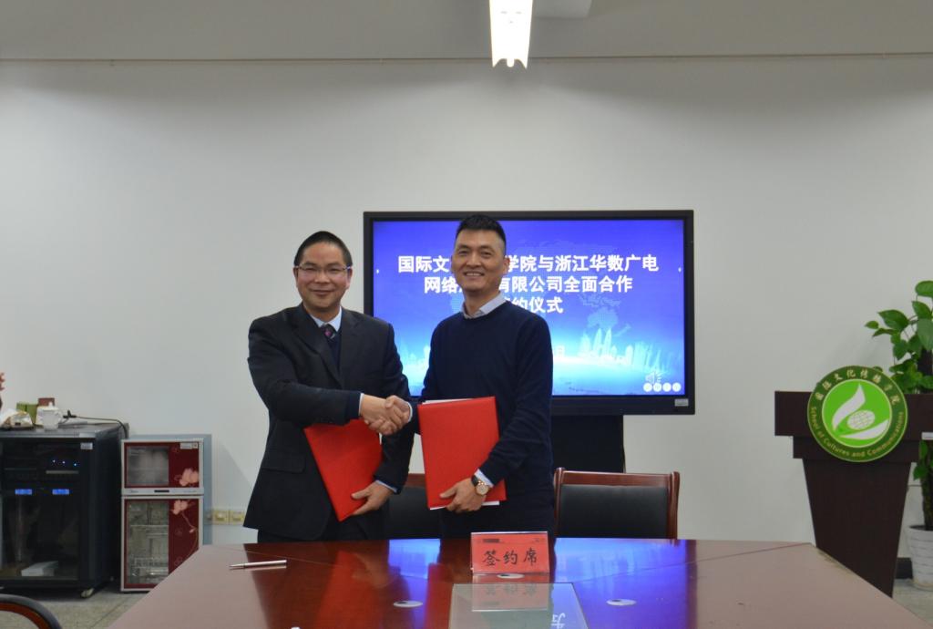 签约仪式上,国际文化传播学院戴运财院长与浙江华数广电网络股份有限公司副总裁沈子强分别代表双方单位在合作协议书上签字。