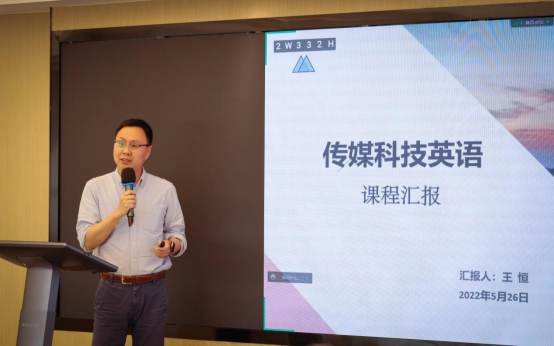 王恒老师课题组展示了《传媒科技英语》课程。王恒老师首先提出大学英语的工具性和人文性的关系,并回溯教育史上长久以来关于“科学主义和人文主义”的争论,展示了其课程改革方向的论证过程,引发与会者深思。《传媒科技英语》以科技科技发展前沿和传媒领域的技术发展为内容依托,以英语语言知识和技能、跨文化交际能力为核心,希望能够帮助学生了解科技英语的语言特征,掌握常用的科技英语词汇,提高科技英语阅读和翻译技能,并在探求科技与大众传媒、科技与艺术的关系中提高英语书面和口头表达能力,促进学生科学素养与人文精神的发展。