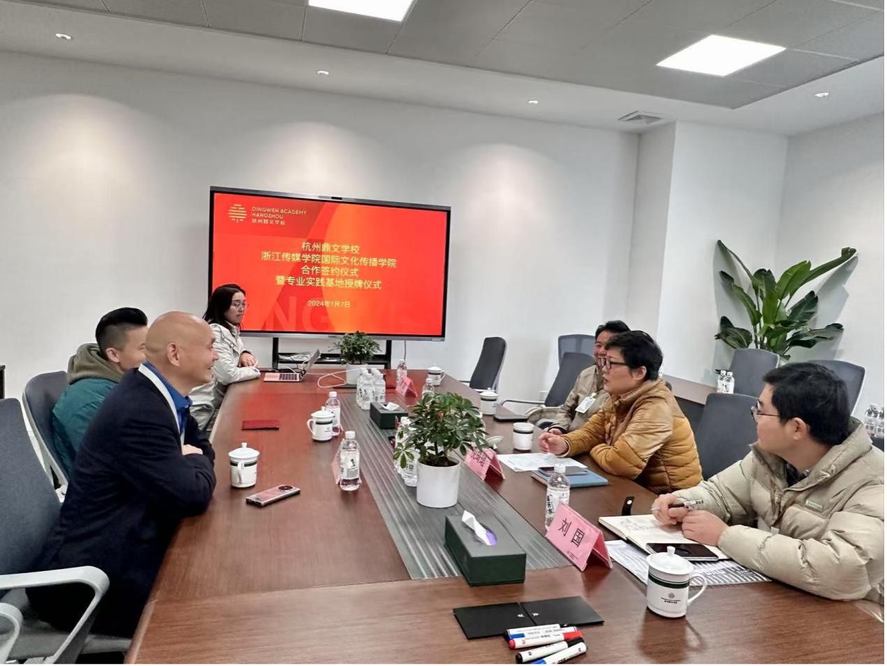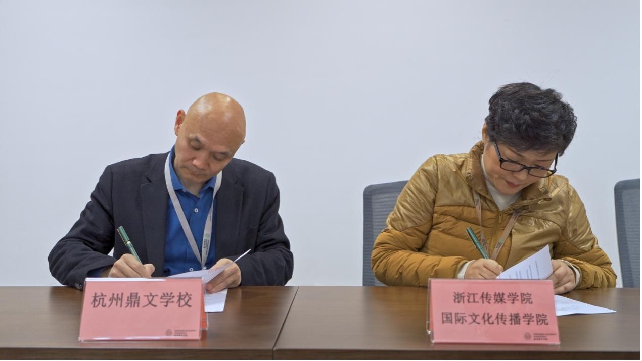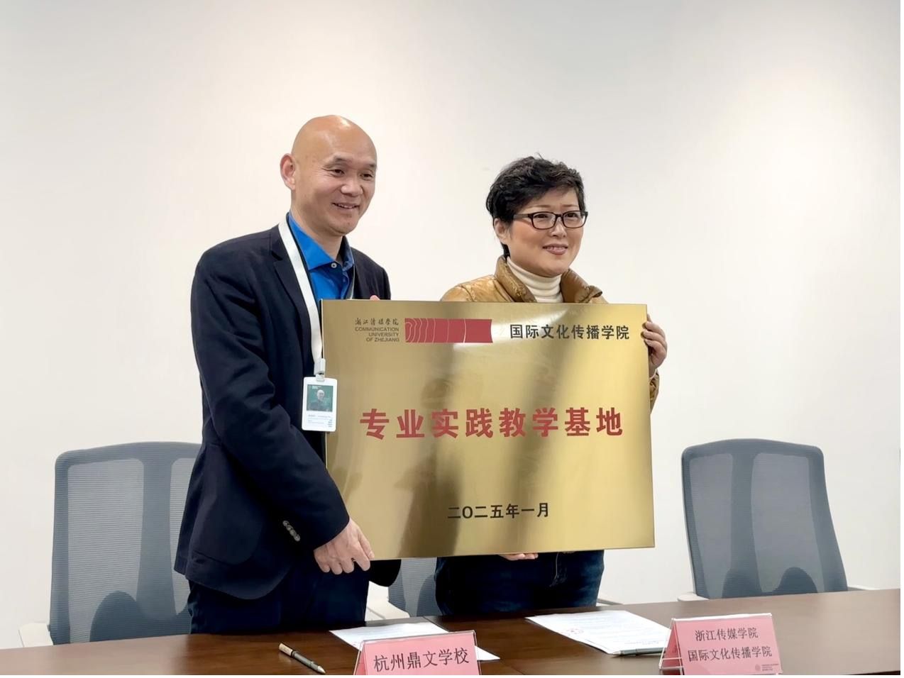经过讨论交流,国际文化传播学院与杭州鼎文学校达成合作共识,双方签署了专业实践教学基地协议,并举行了授牌仪式。