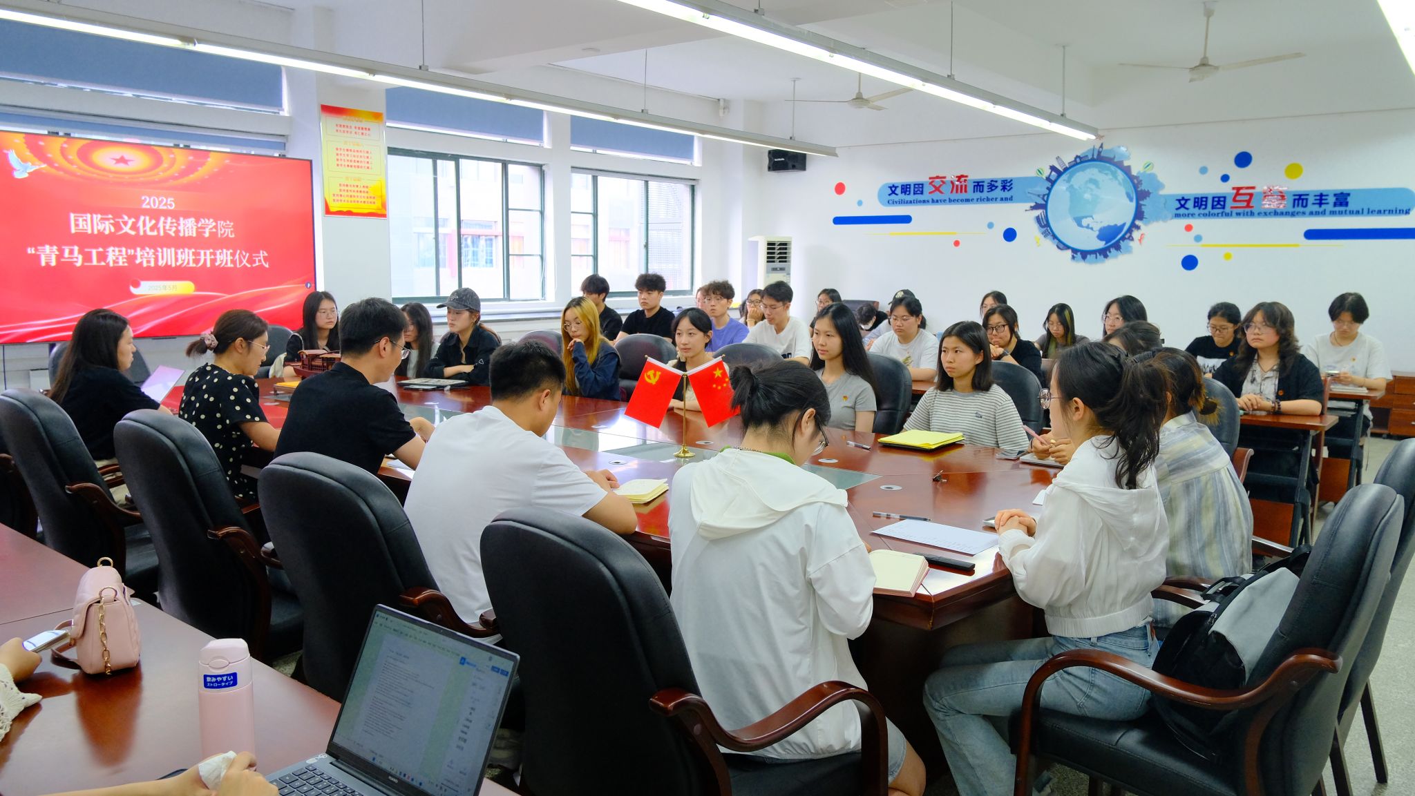 5月22日,国际文化传播学院2025年度“青马工程”培训班开班仪式顺利举行。学院党委副书记吴德政,分团委书记、学工主管胡秀锦,学院学工办全体辅导员出席了本次开班仪式,2025年度青马班全体学员参加。