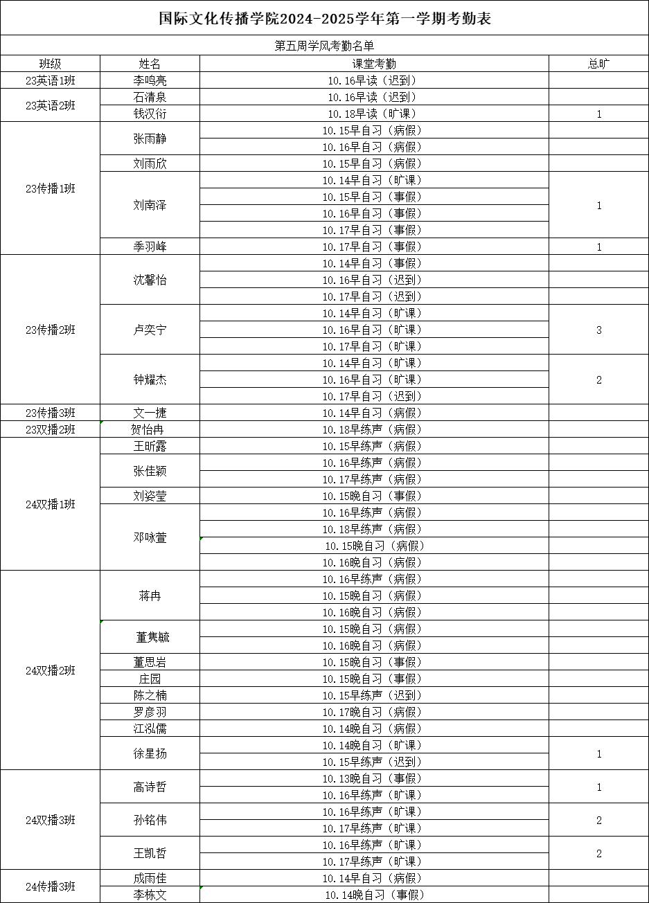 国传 · 考勤|2024-2025学年第一学期第5周学风督察情况公示