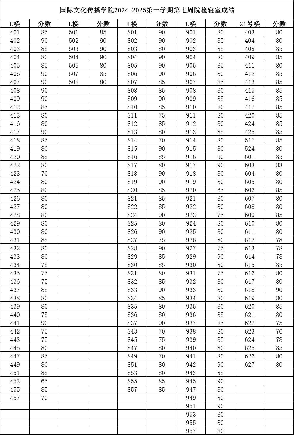 国际文化传播学院2024-2025学年第一学期第七周院检寝室成绩汇总