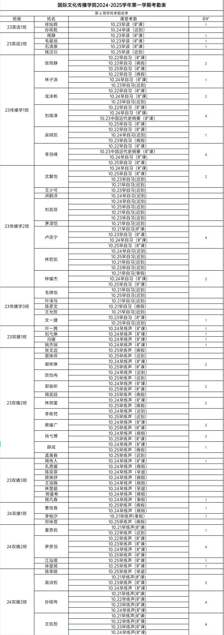 国传 · 考勤|2024-2025学年第一学期第6周学风督察情况公示