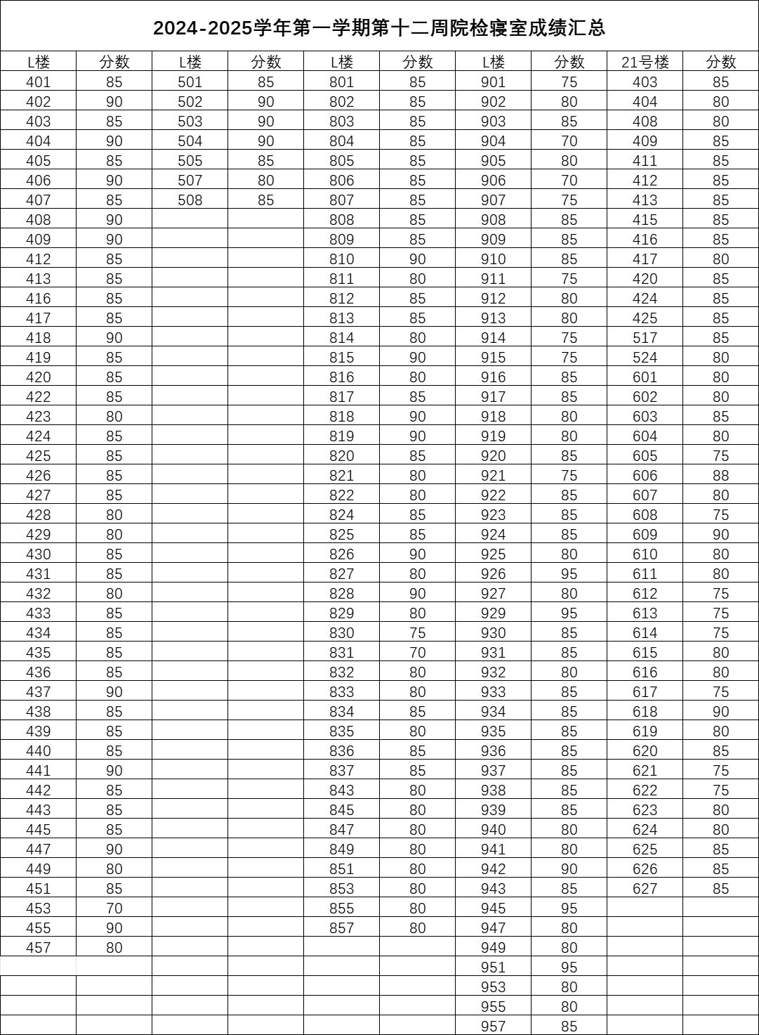 国际文化传播学院2024-2025学年第一学期第十二周院检寝室成绩公示