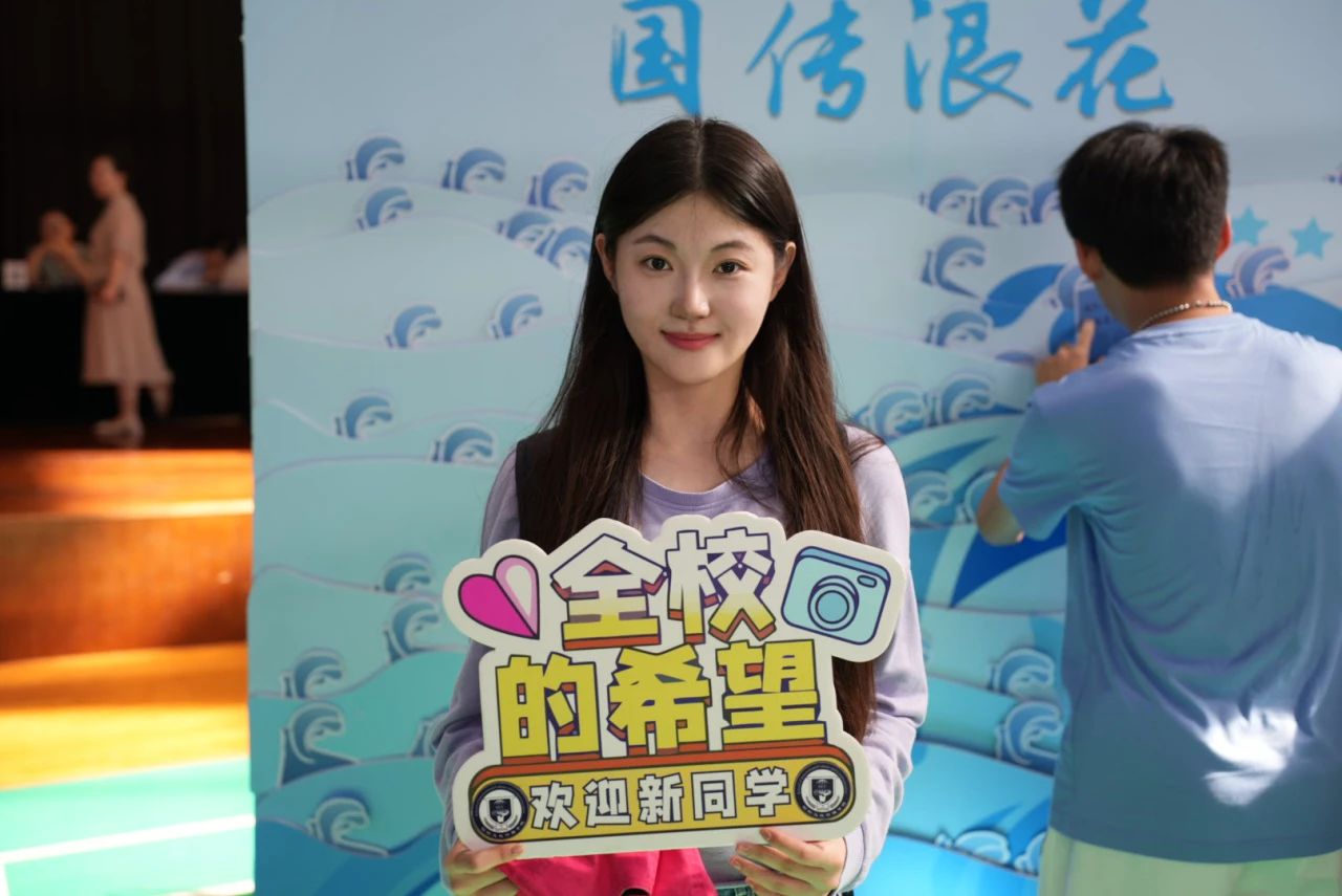 体育馆内,蔚蓝色的“浪花墙”是学院为新生们准备的第一份礼物,“每一片浪花都有声音”,每一张浪花卡片上都有学长姐们亲手写下的对24级国传学子的祝愿。”国传浪花,厚积薄发”新的浪花奔流前行,汇入国传的河流中,也终将去向世界的海洋中,发出专属自己的声音。