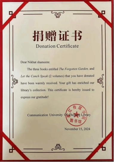 Nikhat Shameem将图书馆视为自己的精神家园。对她而言,阅读不仅是灵魂的慰藉,更是那份在熟悉语言中寻得的独特安宁。将亲笔所著赠予图书馆,无疑是对浙江传媒学院最深情的告白。