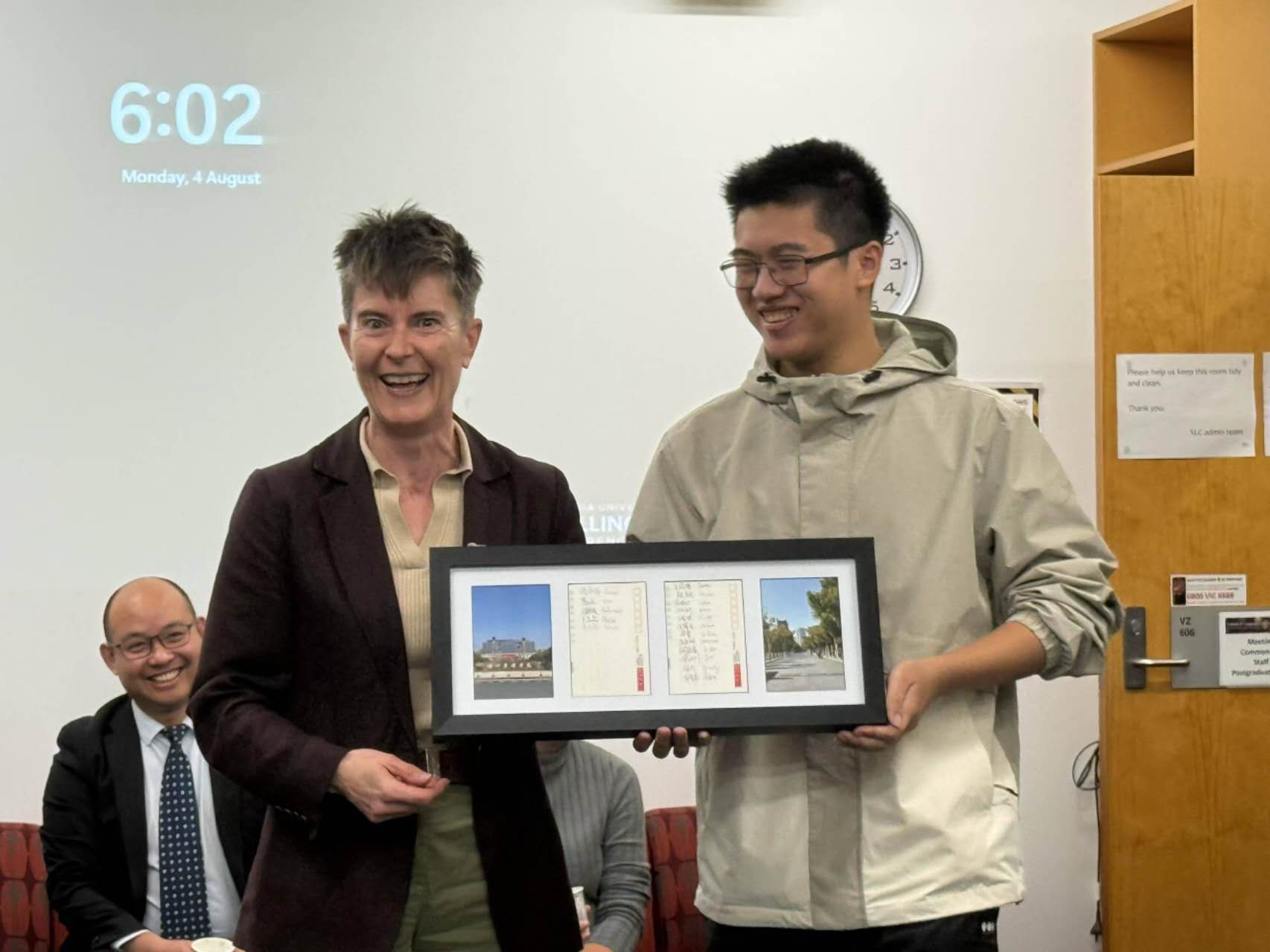 学生代表周灵清在发言中坦言,从杭州到惠灵顿的求学之旅,让我们亲历跨文化沟通的力量。跨国生活的经历和学术交流,正锻造着我们成为全球传播领域的桥梁人才。此外,赖铭烨同学代表全体留学生向维大赠送特殊礼物——贴满学生签名的浙江传媒学院主题明信片,象征两校情谊长存。
