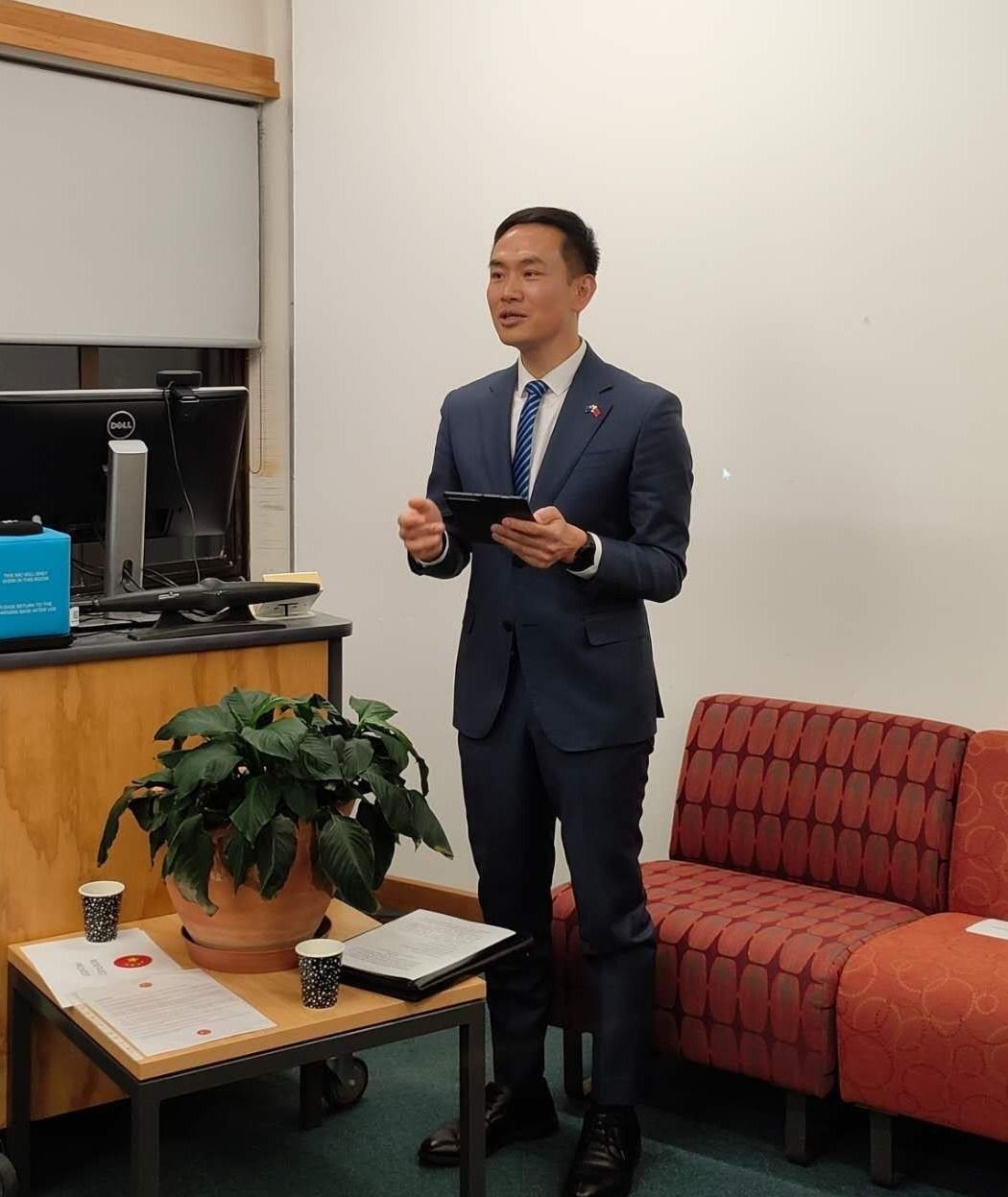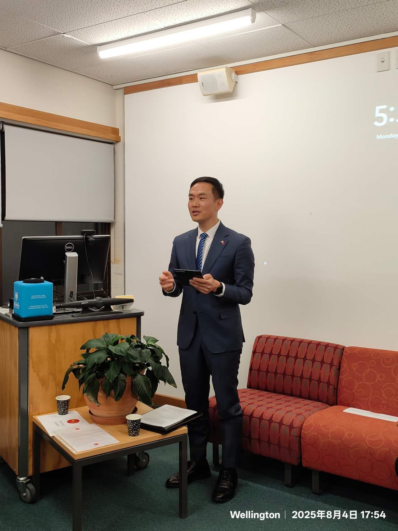 解勇军为欢迎会致辞。他援引2024年相关数据“中国连续多年成为新西兰最大国际学生来源国”,并提到唐太宗“爱之如一”的治国理念与毛利文化中“whanaungatanga”(亲缘纽带)相呼应,正如毛利谚语所言——太平洋之舟唯有同舟共济方能前行,而非凿穿他人船底,特别强调了教育合作对中新关系的重要意义。
