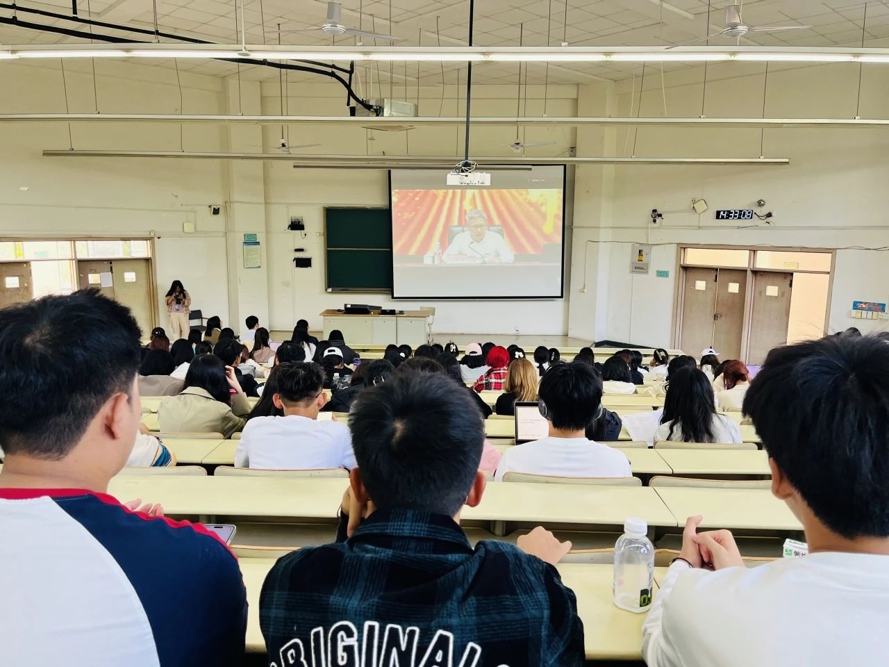 10月8日下午,校党委书记韦国潭为全校2024级新生们讲授思政第一课,我院2024级全体新生在第二教学楼B110聆听本次报告。