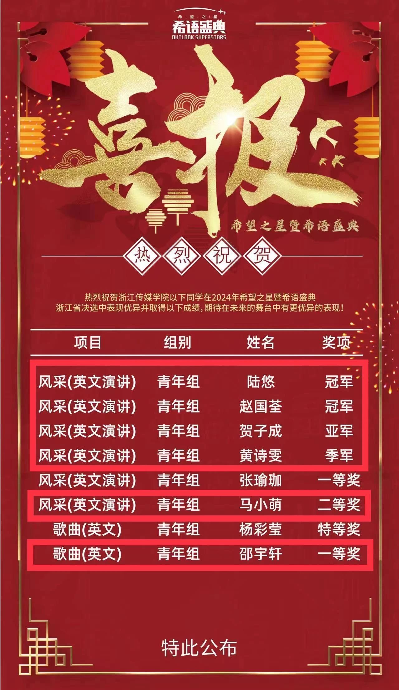 近日,希望之星暨希语盛典比赛浙江省决选结果揭晓。我院共有6名同学获奖其中,冠军2项,亚军1项,季军1项,一等奖1项,二等奖1项。具体获奖名单如下: