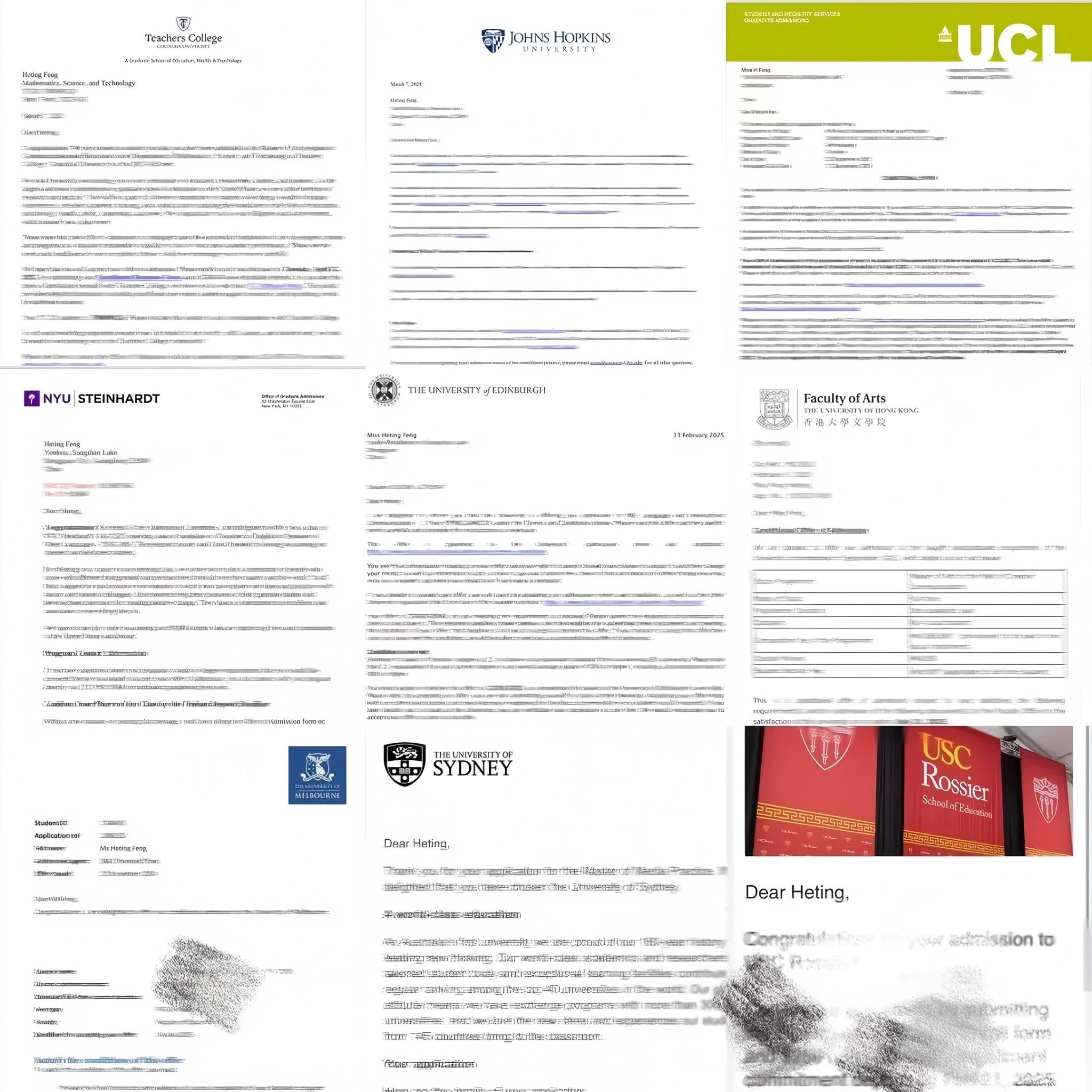 冯鹤汀用努力和热爱浇灌出的种子,在世界遍地开出了绚烂的花。伦敦大学学院、宾夕法尼亚大学、香港大学、悉尼大学、爱丁堡大学、约翰霍普金斯大学、哥伦比亚大学、纽约大学、墨尔本大学等10所QS世界排名前50名的学校,纷纷向她递出了橄榄枝。